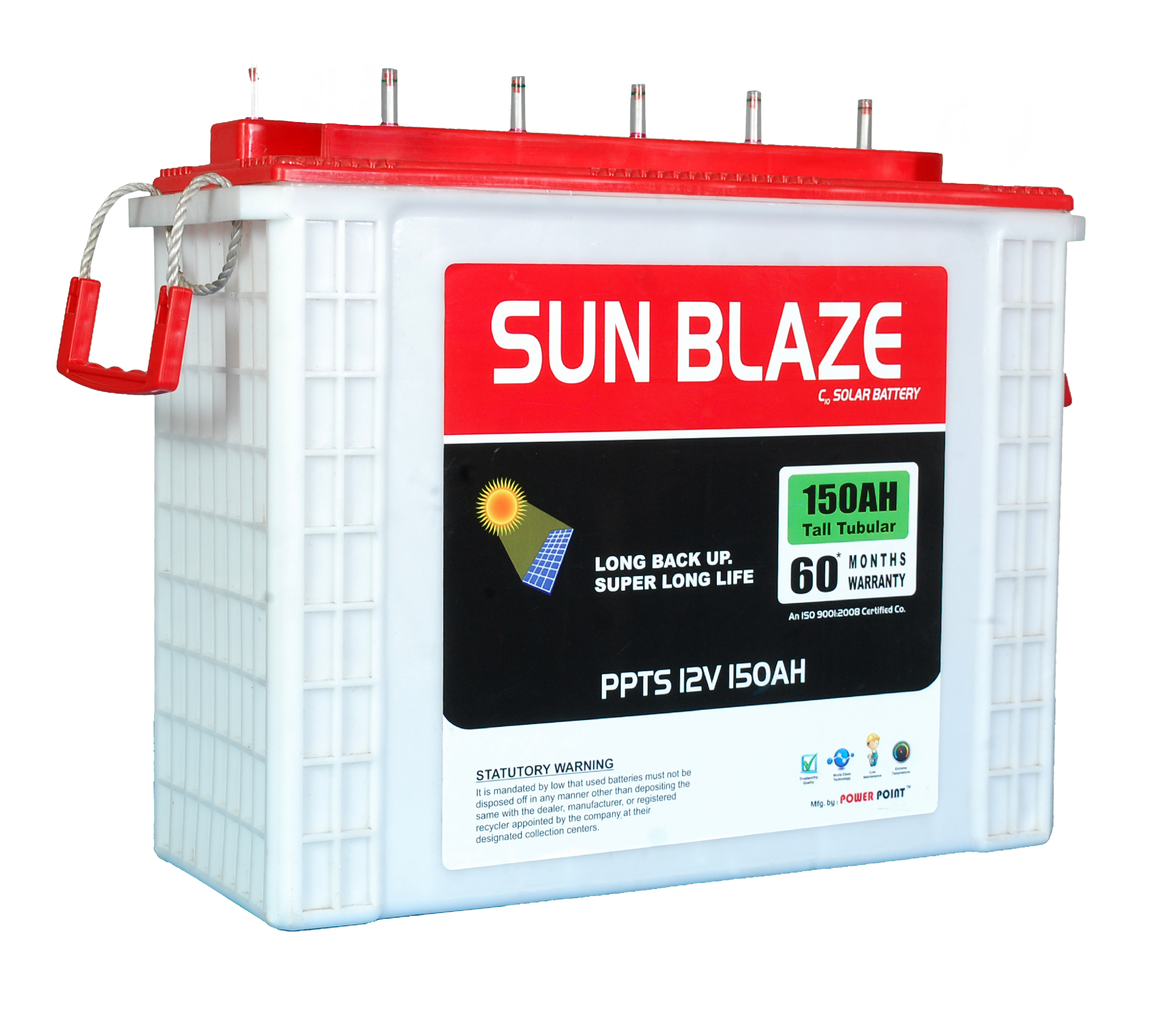 Sun Blaze Solar Batteries are premium, deep-cycle tubular batteries engineered for solar energy systems. Pre-charged at the factory and ready for immediate use, they deliver rapid recharge, extended life cycles, and dependable performance in even the most demanding conditions. Perfect for both oƯ-grid and grid-tied solar setups, they provide eƯicient and consistent energy storage.